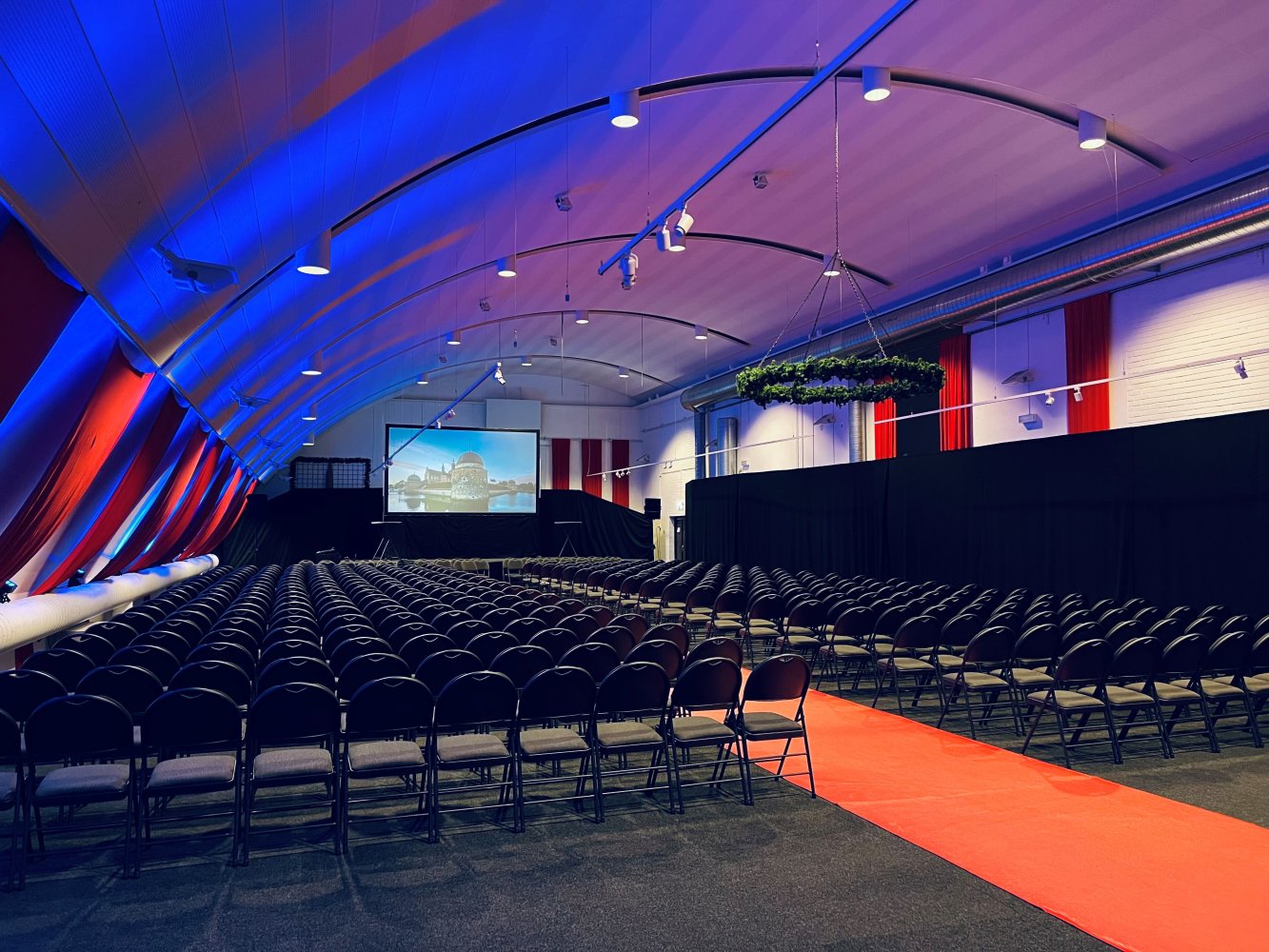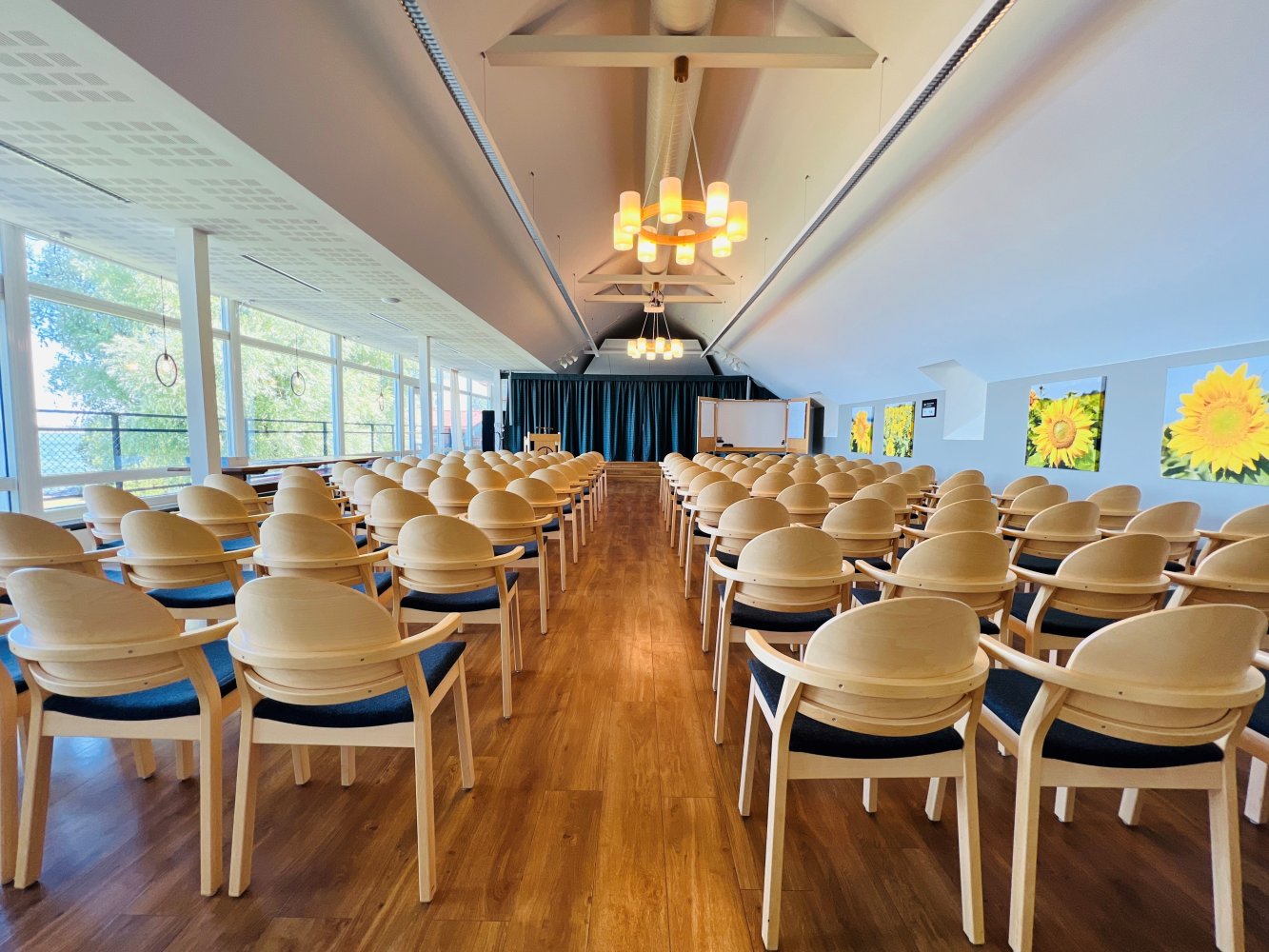 Arken ligger på Vadstena Folkhögskola, som er nabo til vores hovedbygning med en fantastisk udsigt over Vättern. Konferencesalen har også en hævet platform med scenetæppe og et akustisk klaver.